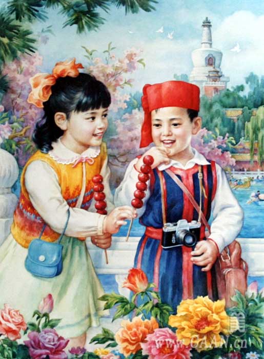 《亲昵》是赵先生1986参加全国首届年画班创作的,作品选取了初春的北海公园的一个情景,一位台湾男孩面对大陆女孩递来的糖葫芦,欲接还羞的表情跃然纸间,通过细节描写,表现了海峡两岸本是一家、理应团圆的深刻主题。这类反映现实生活的作品在其创作中占很大比例。他还创作了一批领袖题材和传统题材的年画作品,其中,《关怀——周总理视察肥光小学》参加了“第六届全国美展”,用擦笔水彩形式画的两幅泰国王族肖像参加了“东方十国美展”,并被泰国友人珍藏。