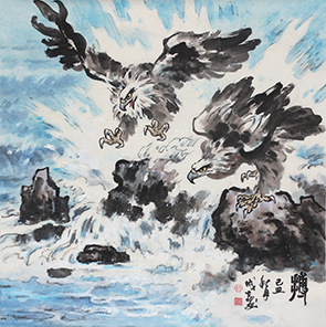 他笔下的山水作品,山峦叠翠,云水浮动,营造了引人入胜的诗画境界。他的花鸟画,松萝缠绕,鸟虫嬉戏,均显花香虫活之妙。值得推荐的是赵先生的鹰画。他善于捕捉鹰的动势和精神,鹰的姿态雄健勇猛,眼睛犀利明亮,羽翼柔韧坚挺,加上苍鹰常伴以虬枝傲干之苍松,两苍相映,更显其英雄气概。《雄视图》、《欲翔图》等均是极具感染力的作品。不难看出,他的鹰画融入了苦禅的笔墨、天寿的章法,甚至融进了八大的技法及现代构成元素。这些作品是广收博取的结晶,画得大气洒脱,笔法凝重而灵动,墨色古拙而清新。 赵成立先生的艺术风格总体来说是淳朴唯美的。他的作品远离世俗的喧嚣与浮躁,是寄性情画感受的结果,不同感受采用不同画法,因而其艺术手法多变。他的创作着眼与尽可能广泛的受众之间的审美传递,因而其作品达到了雅俗共赏的至高境界。 如今,已逾“花甲”之年的赵成立正处在艺术日趋成熟的黄金时期,有理由相信,赵先生将给我们带来一个更加绚丽多彩的艺术世界!(文章作者为已故中国美协理事、安徽省美协名誉主席张松)