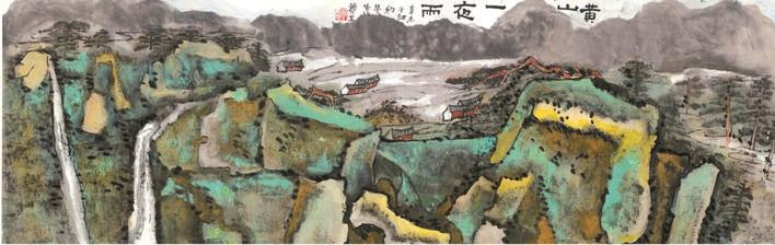 1991年,他创作了《黄山一夜雨》,这幅画完全就是当年挥之不去的黄山印象,经过多年的沉淀后,已经深入骨髓,成为他精神世界里最柔软的触动。这幅画画好后,他记道:“一九六九年夏,余在黄山夜宿半山寺,梦为雨冲去。晨起壁上飞瀑悬空。遂扣天门而上天都峰。匆匆已二十二年……”